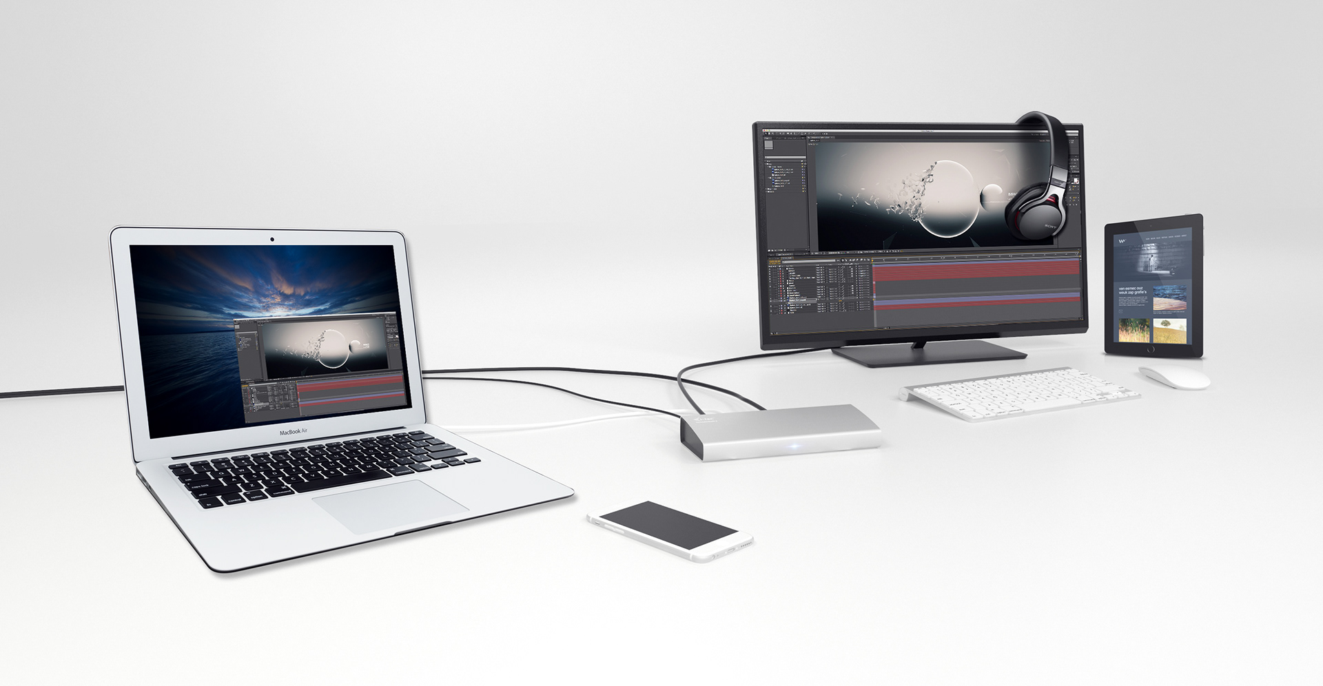 This universal docking station will significantly increase the comfort of using your MacBook. It will allow connection of your favourite pieces of hardware such as a keyboard, mouse, external disk, printer, an audio system, internet modem, another monitor, etc. by a single Thunderbolt 2 cable (One-Touch-System). This way you will avoid perpetual connecting and disconnecting of these pieces of hardware whenever you carry your notebook or tablet with you. Another advantage is better organization of your desktop and removal of the unorganized clutter of cables.